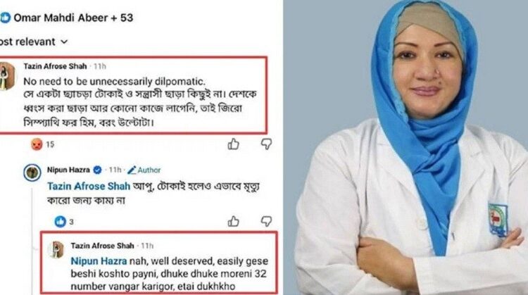 সেই স্ট্যাটাসে গিয়ে তাজিন আফরোজ শাহ কমেন্টসে মন্তব্য করেন, ‘নো নীড টু বি আন নেসেসারিলি ডিপ্লোমেটিক’, সে একটা ছ্যাঁচড়া টোকাই ও সন্ত্রাসী ছাড়া কিছুই না। দেশকে ধ্বংস করা ছাড়া আর কোনো কাজে লাগেনি, তাই জিরো সিম্প্যাথি ফর হিম, বরং উল্টোটা।’