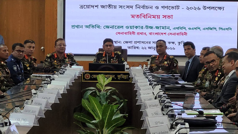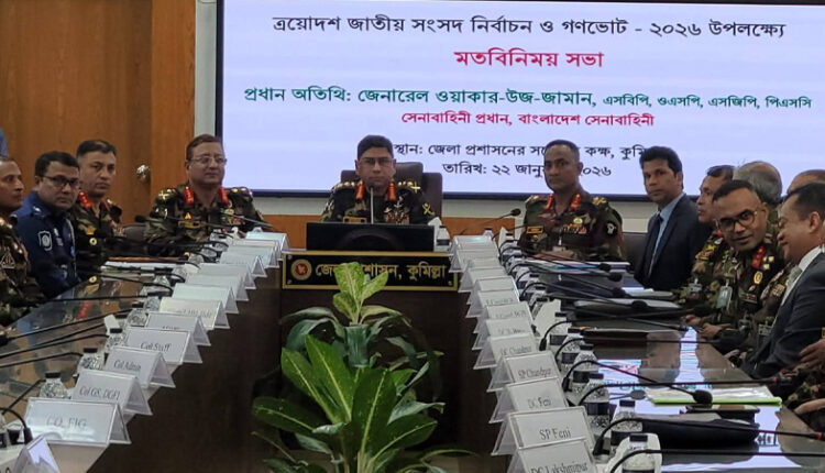 আসন্ন ত্রয়োদশ জাতীয় সংসদ নির্বাচন ও গণভোট-২০২৬ উপলক্ষ্যে সার্বিক আইনশৃঙ্খলা পরিস্থিতি মূল্যায়ন এবং ‘ইন এইড টু দ্য সিভিল পাওয়ার’ এর আওতায় কুমিল্লা এরিয়া পরিদর্শন ও মতবিনিময় সভা করেছেন সেনাবাহিনী প্রধান জেনারেল ওয়াকার-উজ-জামান।